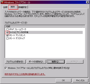 ◇例外タブをクリックしてください。 ↓[ファイルとプリンタの共有]をチェックしてください。