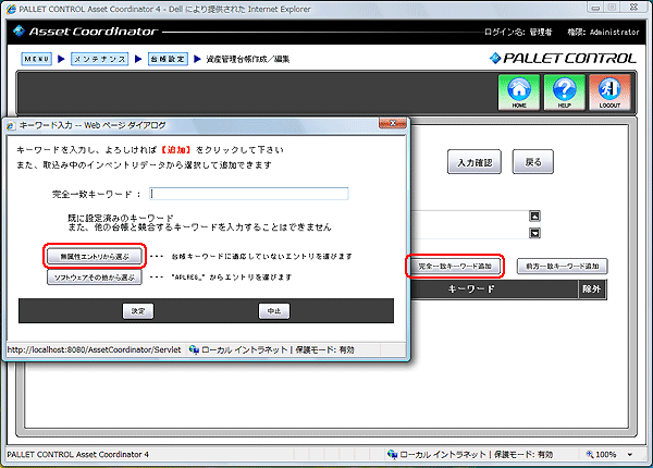 [MENU] > [メンテナンス] > [台帳設定] > [資産管理台帳作成/編集]から[資産管理台帳作成]または[台帳キーワード追加]を行う手順の中にエントリのキーワードを台帳に設定する個所があります。そこで[完全一致キーワード追加]を選択すると[無属性エントリから選ぶ]ボタンがあります。